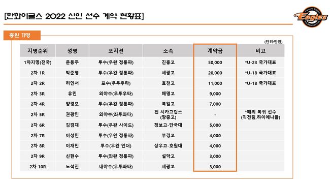 한화는 8일 2022 신인 선수 11명과 입단 계약을 완료했다고 밝혔다. 문동주가 5억원을, 2차 1라운드 전체 1순위 투수 박준영(세광고)이 2억원으로 2명의 선수가 2억원 이상 고액을 받았다.