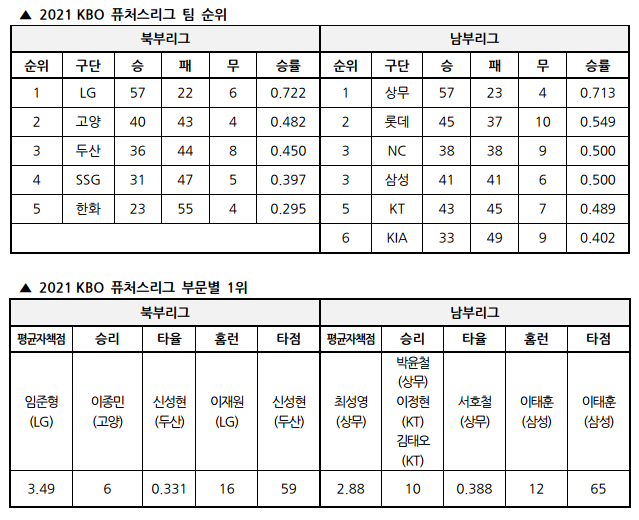 2021 KBO 퓨처스리그는 11개 팀이 북부(LG, 고양(히어로즈), 한화, 두산, SSG)와 남부(상무, NC, 롯데, KIA, 삼성, KT) 2개 리그로 나뉘어 진행됐다. 북부리그는 LG 트윈스가 2년 연속 우승을 차지했고, 남부리그는 상무 야구단이 2012년 이후 10년 연속 정상에 등극했다.