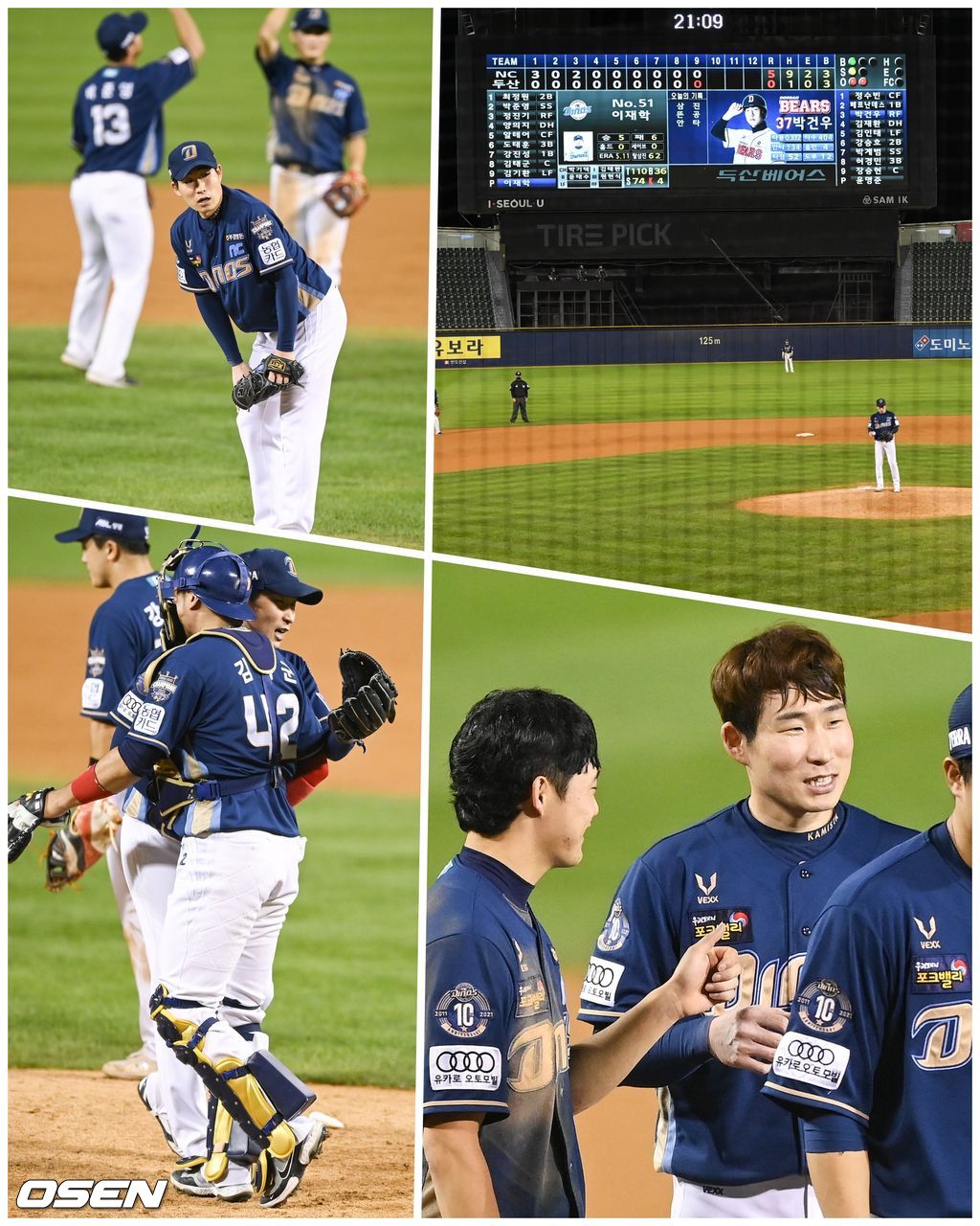 100구 가까운 투구수에도 불구하고 9회에 등판했던 이재학은 노히트를 깼던 박건우를 마지막 타자로 상대로 내야땅볼 잡으며 이날의 완봉승을 완성했다. 8년전 생애 첫 완봉승을 거뒀던 그날처럼 이날도 김태군 포수와 포옹을 하며 감격스러운 순간을 함께했다.