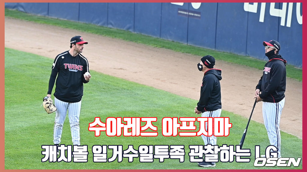 이른 교체로 우려를 산 LG 외국인투수 수아레즈가 코치진의 일거수일투족 관찰 속 캐치볼 훈련을 펼쳤다.