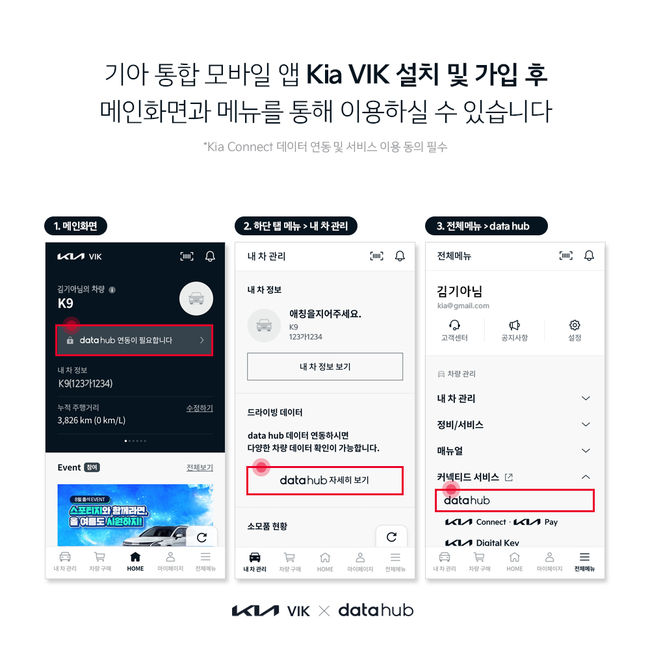 ‘datahub 서비스’는 기아 통합모바일 앱인 기아 빅(Kia VIK)의 데이터를 기반으로 개인화 된 솔루션을 제공하는 서비스다.