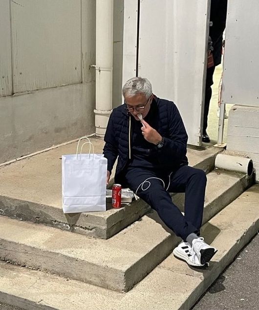 무리뉴 감독이 지휘하는 AS로마는 지난 28일 칼리아리 원정경기서 2-1로 이겼다. 경기 후 무리뉴 감독은 길바닥에서 식사하는 자신의 사진을 SNS에 올렸다.
