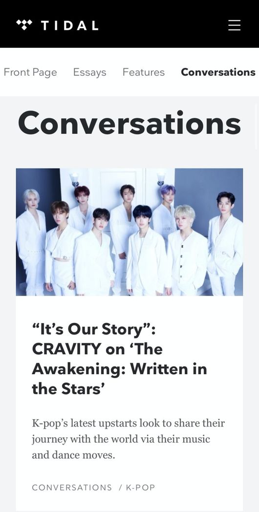 최근 전 세계 고음질 스트리밍 서비스 1위를 자랑하는 미국 타이달 홈페이지에는 타이달의 에디터이자 빌보드 K팝 칼럼니스트로 활동 중인 제프 벤자민과 함께한 크래비티의 매거진 인터뷰가 공개됐다.