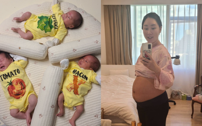 영상에는 침대 세개에 나란히 누워있는 세 쌍둥이의 모습이 담겼다. 이들은 각각 베이컨, 양상추, 토마토가 그려진 노란색 옷을 세트로 맞춰 입고 사랑스러운 매력을 발산하고 있다.