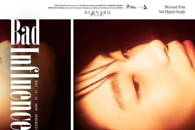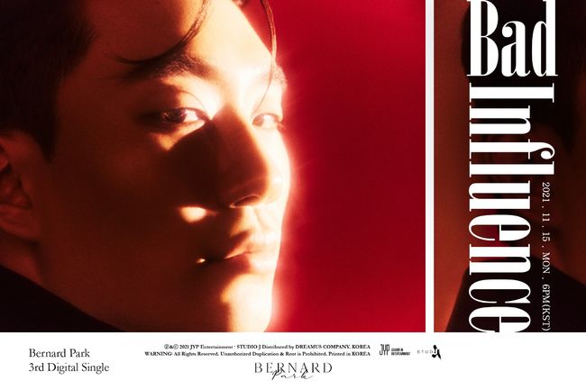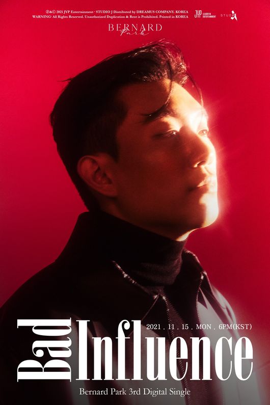 버나드 박은 11월 15일 새 디지털 싱글 'Bad Influence'(배드 인플루언스) 발매를 앞두고 컴백 어나운스먼트 이미지, 필름, 트랙리스트 등 관련 콘텐츠를 차례로 오픈하고 있다. 파격 변신을 예고한 첫 티저 이미지에 이어 JYP엔터테인먼트는 9일 0시 공식 SNS 채널을 통해 강렬함과 따뜻함이 공존하는 두 번째 콘셉트 포토를 게재해 눈길을 모았다.