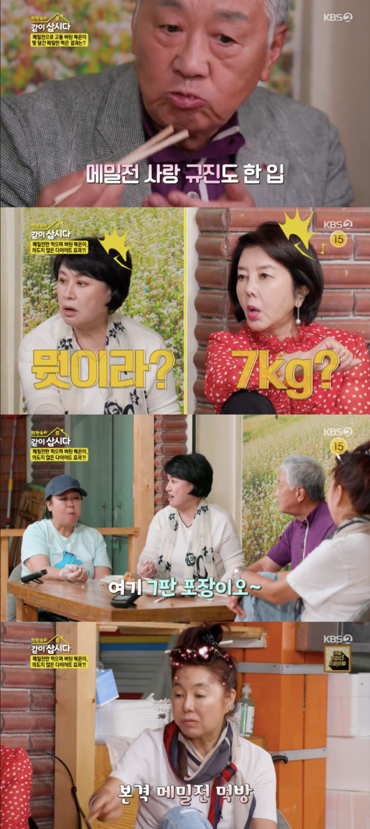 혜은이는 “아무 것도 먹기 힘들었다. 근데 메밀전만 먹을 수 있었다. 그 때 7kg이 빠졌다”라고 말해 모두를 놀라게 만들었다. 이를 들은 박원숙은 더 식욕이 당긴다며 메밀전을 먹기 시작했다.