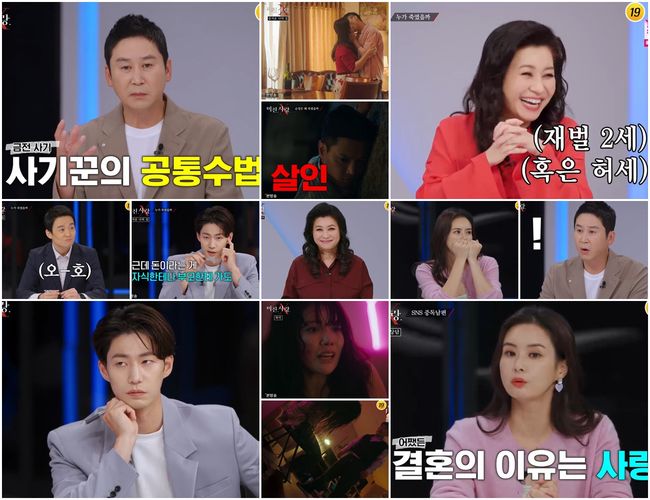 먼저 “가장 달콤하고도 잔혹한 이야기 치정 스릴러 ‘미친.사랑.X’”라는 MC 신동엽의 외침과 함께 오은영 박사, 손수호 변호사, 첫 번째 게스트 배우 송재림이 인사를 건넸다. ‘미친.사랑.X’ 프로그램 제목을 들었을 때 어떤 생각이 들었냐는 신동엽의 질문에 송재림은 “최근에 하도 이상한 일이 많이 일어나니까 시사적으로 다뤄야 되는 문제인가 싶다”는 의미심장한 대답을 내놨다.