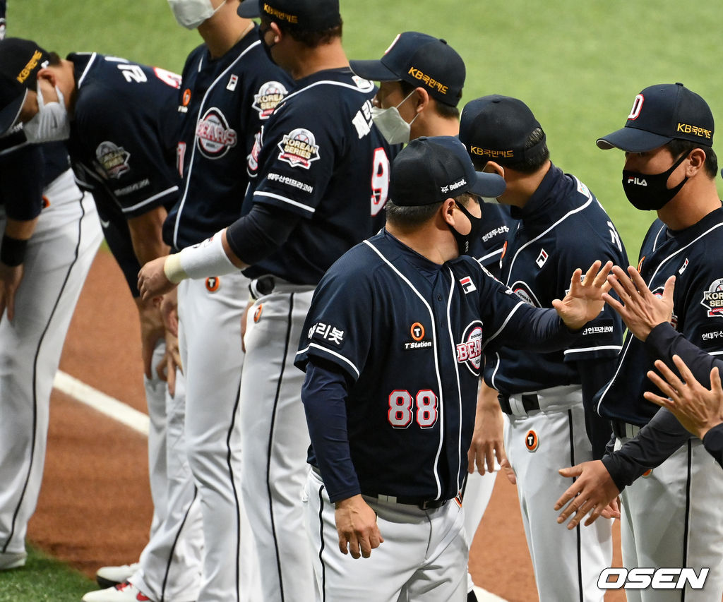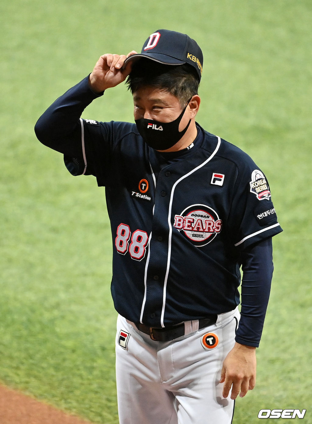 그리고 한국시리즈 1차전이 열린 14일. 경기전 공식행사가 열렸다. 양팀 선수들이 진행자의 호명에 그라운드에 입장했다. 김태형 감독이 입장하며 선수들과 하이파이브를 나눴다. 그런데 박건우의 손이 김태형 감독 엉덩이를 향했다. 선수들도 당황했고 순간 웃음이 터져 나왔다. 김태형 감독 역시 웃음을 참지 못하고 이 상황을 받아들였다.