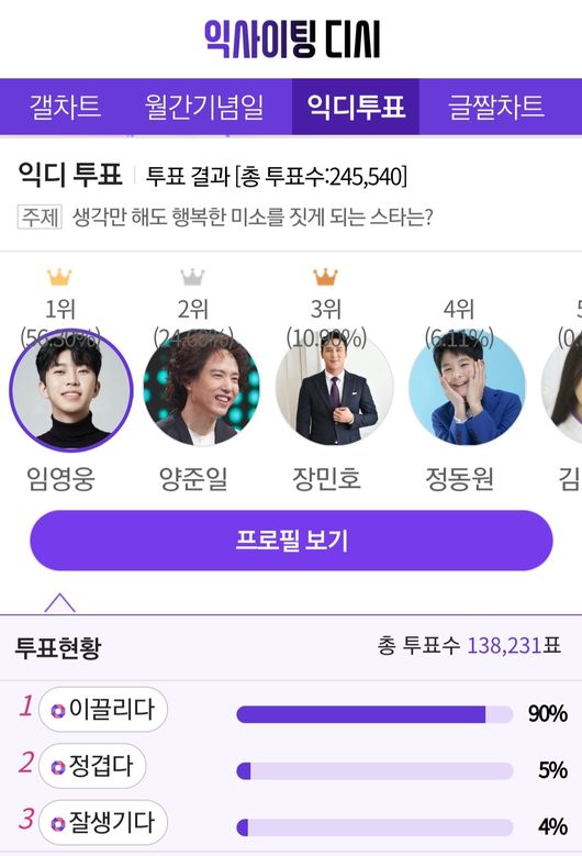 21일 투표 웹서비스 익사이팅디시에 따르면 지난 14일부터 어제(20일)까지 일주일 동안 '생각만 해도 행복한 미소를 짓게 되는 스타는?'이라는 주제로 설문조사를 진행됐다.