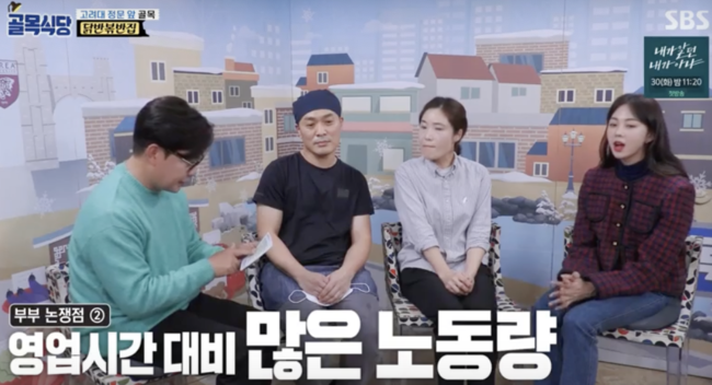 이날 백종원이 닭반볶반집이 그려졌다. 남편 사장은 “아내는 나를 일러서 저를 혼나게 하려는 것 같다”며 견제, 아내가 남편이 변해줬으면 하는 건지 묻자 아내 사장은 “본인은 그렇게 생각한 것 같다, 자기 혼자 다 하려는 걸 내려놨으면 한 것”이라며 몸은 몸대로 혹사하고 돈은 돈대로 안 되는 악순환의 연속이라고 했다.