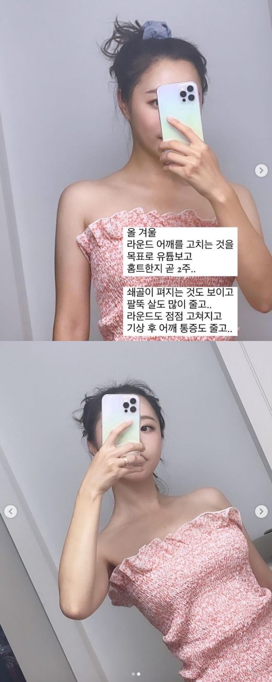 이솔이는 지난 24일 자신의 SNS에 “올 겨울 라운드 어깨를 고치는 것을 목표로 유튜브보고 홈트한지 곧 2주. 쇄골이 펴지는 것도 보이고 팔뚝 살도 많이 줄고. 라운드도 점점 고쳐지고 기상 후 어깨 통증도 줄고”라며 두 장의 사진을 게재했다.