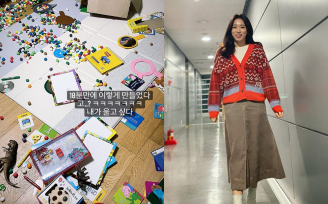 하지만 이미도는 "10분 뒤.. 울고불고 난리여서 문열었더니.."라며 처참해진 방 안의 풍경을 공개했다. 마치 폭탄이라도 터진 듯 방 곳곳에 장난감들이 흩뿌려져 있는 모습. 이에 이미도는 "10분만에 이렇게 만들었다고..?"라고 헛웃음을 지으며 "내가 울고 싶다"고 심경을 토로했다.