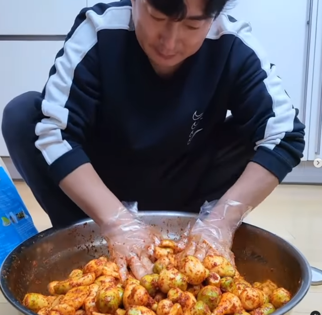사진에는 커다란 대야에 한가득 담겨있는 무에 양념을 버무리고 있는 이수근의 모습이 담겼다. 익숙한듯 능숙하게 양념을 버무리는 자세가 눈길을 끈다.
