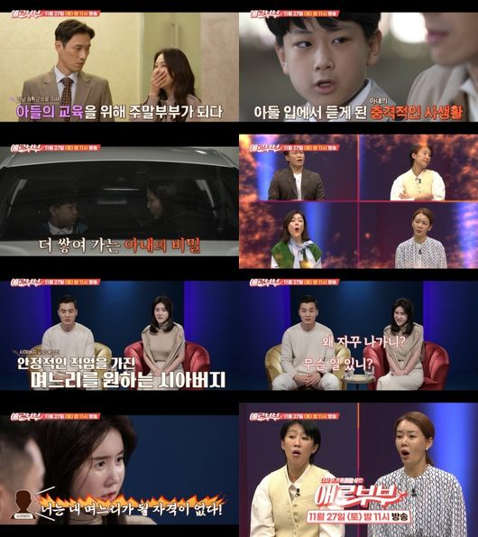 27일 방송될 ‘애로부부’의 ‘애로드라마’ 예고편은 아들의 교육을 위해 강남 8학군으로 이사를 하고 주말부부가 된 어느 행복한 부부의 모습으로 시작됐다. 하지만, 어느 날 남편은 아들로부터 “엄마가 말하면 안 된댔어”라는 말을 들었다. 이어 아내가 다른 남자와 함께 있는 모습, 아들에게 “아빠한테 말하면 안 돼”라며 주의를 주는 장면이 이어졌다. 아들의 입을 통해 아내의 사생활을 들은 남편은 눈물을 흘렸고, MC 홍진경은 “저 여자 최악”이라며 질색했다.