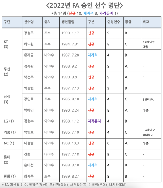 2022년 FA 승인 선수는 KT 장성우, 허도환, 황재균, 두산 김재환, 박건우, 삼성 백정현, 강민호, 박해민, LG 김현수, 키움 박병호, NC 나성범, 롯데 정훈, 손아섭, 한화 최재훈 등 총 14명이다.