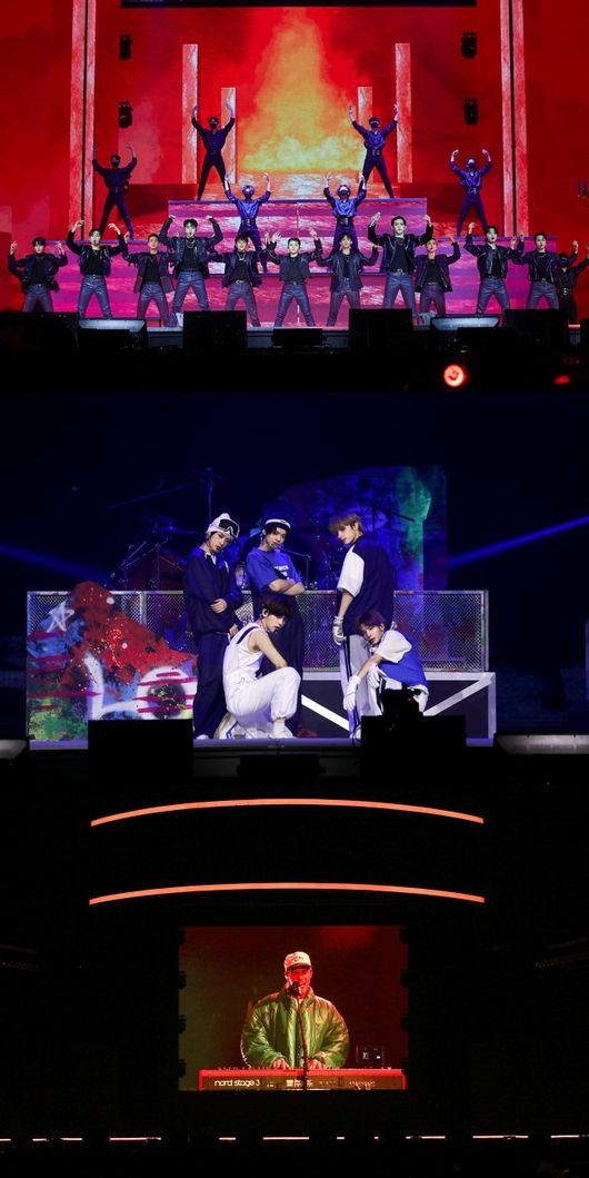 투모로우바이투게더는 ‘혼돈의 장: FREEZE’의 타이틀곡 ‘0X1=LOVESONG (I Know I Love You) feat. Seori’(제로 바이 원 러브송)으로 자신들의 무대를 열었다. 화려한 퍼포먼스로 시선을 압도한 이들은 ‘Anti-Romantic’과 휴닝카이의 솔로 퍼포먼스가 더해진 ‘Frost’에 이어, ‘No Rules’와 ‘Magic’ 매시업, ‘LO$ER=LO♡ER’(루저 러버) 등을 연이어 선보여 분위기를 고조시켰다.