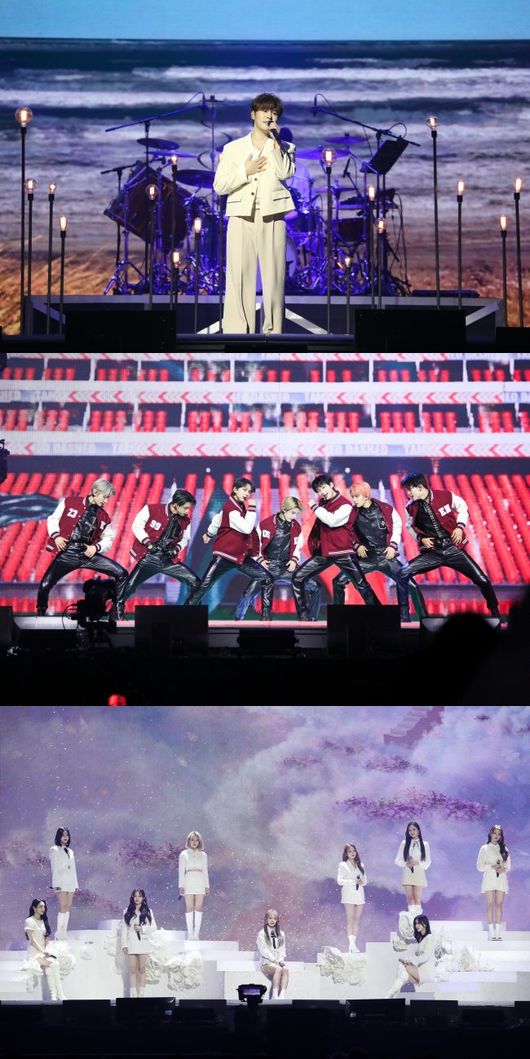 ‘Tamed-Dashed’까지 특유의 강렬한 퍼포먼스를 선보인 ENHYPEN의 무대를 뒤로 하고 프로미스나인과 범주의 무대가 공개됐다. 프로미스나인은 레드힐을 이용한 퍼포먼스로 보는 재미를 더한 ‘Feel Good (SECRET CODE)’과 ‘WE GO’로 상큼하고 발랄한 매력을 뽐냈다. ‘JUST’로 무대를 연 범주는 폭발적인 가창력과 짙은 감성으로 신곡 ‘차라리 사랑하지 말 걸 그랬어’와 ‘28.5’을 열창, 몰입도를 높였다.