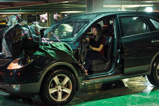 세 번째 프로덕션 비하인드는 박소담의 흔들림 없는 액션 투혼이 빛나는 ‘주차타워 액션’ 장면이다. 말 그대로 생존형 액션을 선보이는 ‘은하’가 스프링클러를 시원하게 터뜨리는 씬은 현장에서 나온 즉흥적인 아이디어였다. 바닥이 물로 흠뻑 젖어 미끄러운 상황이기 때문에 카체이싱 액션의 속도감을 내는 것이 가장 힘들었다는 후문이다. 쉽지 않은 환경 속에서도 박대민 감독과 제작진의 카메라 렌즈와 앵글에 다채로운 변주를 주며 차량의 움직임을 속도감 넘치게 표현해냈다. 뿐만 아니라 핸들을 꺾으며 동시에 유압 사이드 브레이크를 당기는 동작과 같은 고난도 카체이싱 액션을 훌륭하게 소화해낸 박소담 배우의 열연이 더해져 리얼리티의 격을 더욱 높였다.