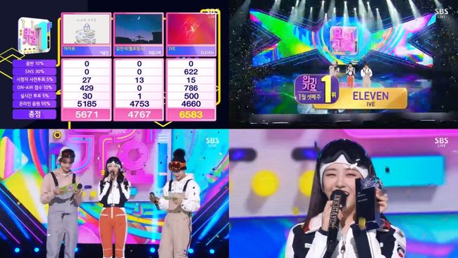 지난 16일 오후 방송된 SBS ‘인기가요’에서 아이브(유진, 가을, 레이, 원영, 리즈, 이서)는 데뷔 타이틀 ‘ELEVEN(일레븐)’으로 1위 트로피를 거머쥐었다.