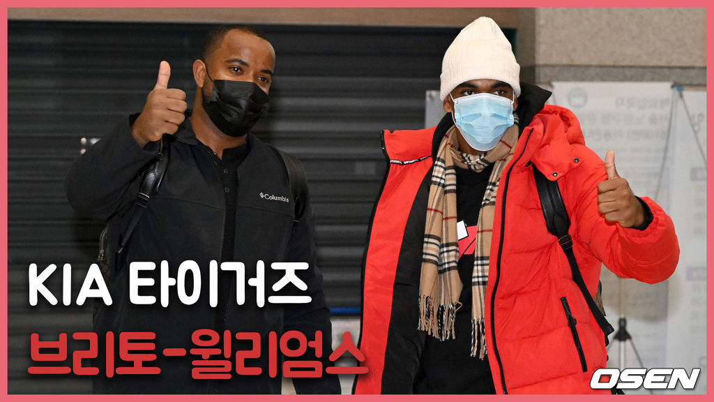 KIA 새 외국인 선수 브리토, 윌리엄스가 입국하며 취재진을 향해 포즈를 취하고 있다. 2022.01.20 /ksl0919@osen.co.kr