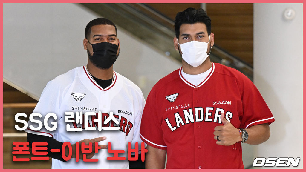 SSG 윌머 폰트, 이반 노바가 취재진을 향해 포즈를 취하고 있다.2022.01.21 /ksl0919@osen.co.kr