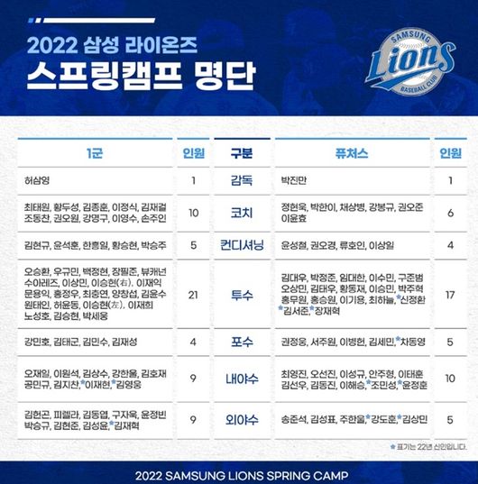 삼성 라이온즈가 26일 2022시즌 스프링캠프 명단을 확정 발표했다.
