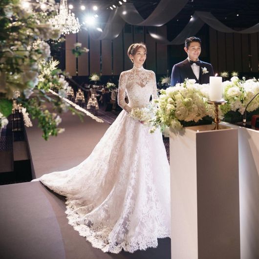 또 왕지원은 결혼식 사진도 함께 공개해 눈길을 끌었다. 화려한 레이스로 장식된 순백의 웨딩드레스를 입은 왕지원은 숏컷 스타일로 세련된 웨딩룩을 완성했다. 턱시도를 멋지게 차려 입은 박종석과 행복한 미소를 지으며 기뻐하고 있다.