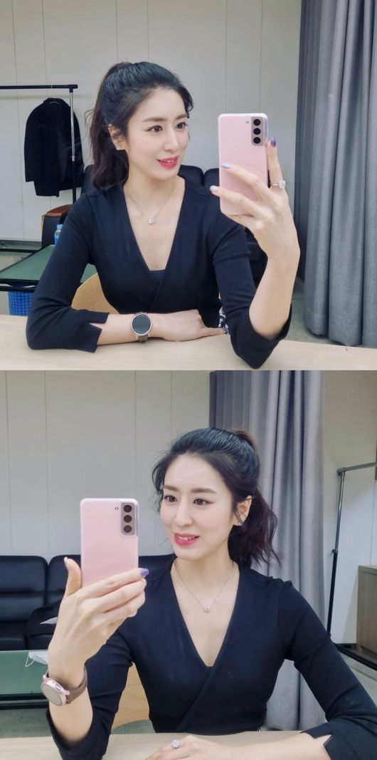 공개된 사진 속 민혜연은 촬영 대기 중 셀카를 촬영 중인 모습이다.