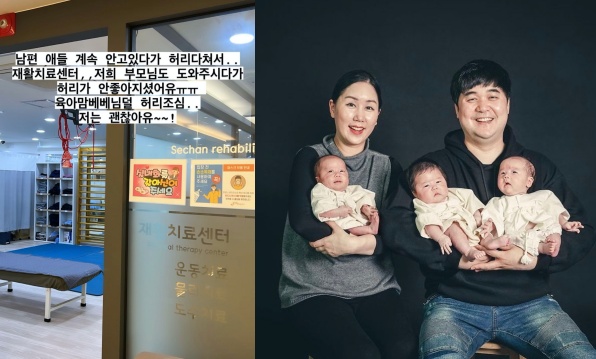 공개된 사진 속 황신영은 세쌍둥이 육아를 하던 중 허리를 다친 남편과 함께 재활치료센터를 방문한 모습이다.
