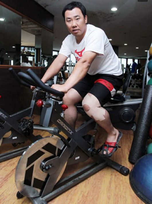 <사진>A사 헬스바이크를 당시 KIA 이범호 선수가 무릎 수술 후 재활 운동에 적극 활용하고 있던 모습