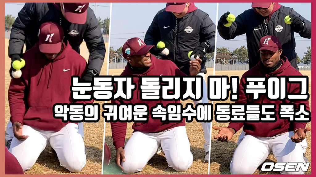 김지수 코치의 지도 아래 얼굴 옆으로 떨어지는 공을 잡아내는 동체시력 강화 및 순발력 훈련. 푸이그는 이 훈련에서 공 하나를 호주머니 속에 숨기는 등 장난을 치며 동료들의 웃음을 자아내게 만들었다.