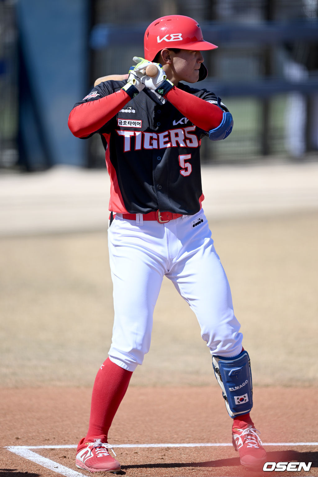 김도영은 5일 오후 부산 기장군 기장-현대차 드림 볼파크에서 열린 KT와의 연습경기에서 2번 타자 유격수로 선발 출전했다.
