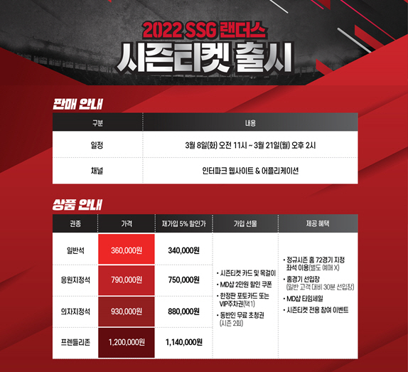 이밖에 SSG는 시즌티켓 고객을 위해 특정 경기 내 할인혜택을 제공하는 MD샵 타임세일과 시즌티켓 전용 참여 이벤트 등 다채로운 혜택도 마련할 예정이다.