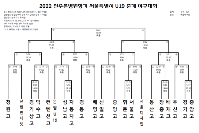 이번 대회는 3월 16일 오전 9시 선린인터넷고와 청원고간의 경기를 시작으로 3월 23일까지 목동야구장에서 펼쳐지며 결승전은 3월 23일 오후 1시 30분에 열리게 됩니다. 올 한해 고교야구 패권의 향배를 알려줄 선수촌병원장기 서울시 춘계 고교야구대회에 많은 관심 부탁드립니다.