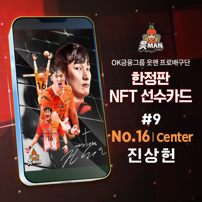 OK금융그룹 읏맨 프로배구단(이하 OK금융그룹 배구단)은 20일 오후 6시 9번째 NFT 카드를 배포한다고 밝혔다. 이번 NFT 카드 주인공은 센터 진상헌이다.