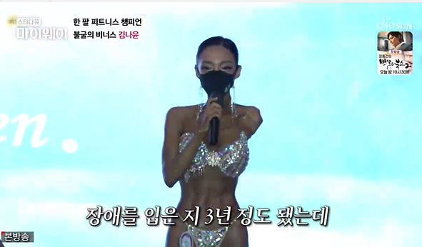 이날 한 팔 피트니스 챔피언이 된 불굴의 비너스, 김나윤을 만나봤다. 그는 장애로 네 살이 되었다며 4년 전 사고로 팔을 잃게 됐다고 했다.