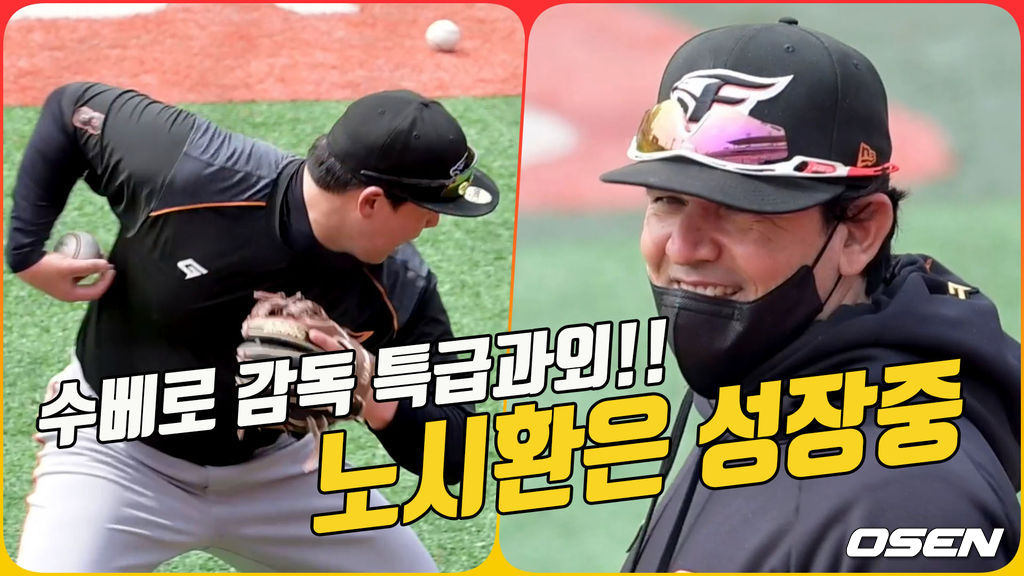 경기에 앞서 한화 수베로 감독이 노시환과 그라운드에서 함께 호흡하며 수비 훈련을 돕고 있다. 한화의 대표 3루수 노시환은 특유의 긍정 에너지로 수베로 감독의 집중 관리 아래 성장중이다.