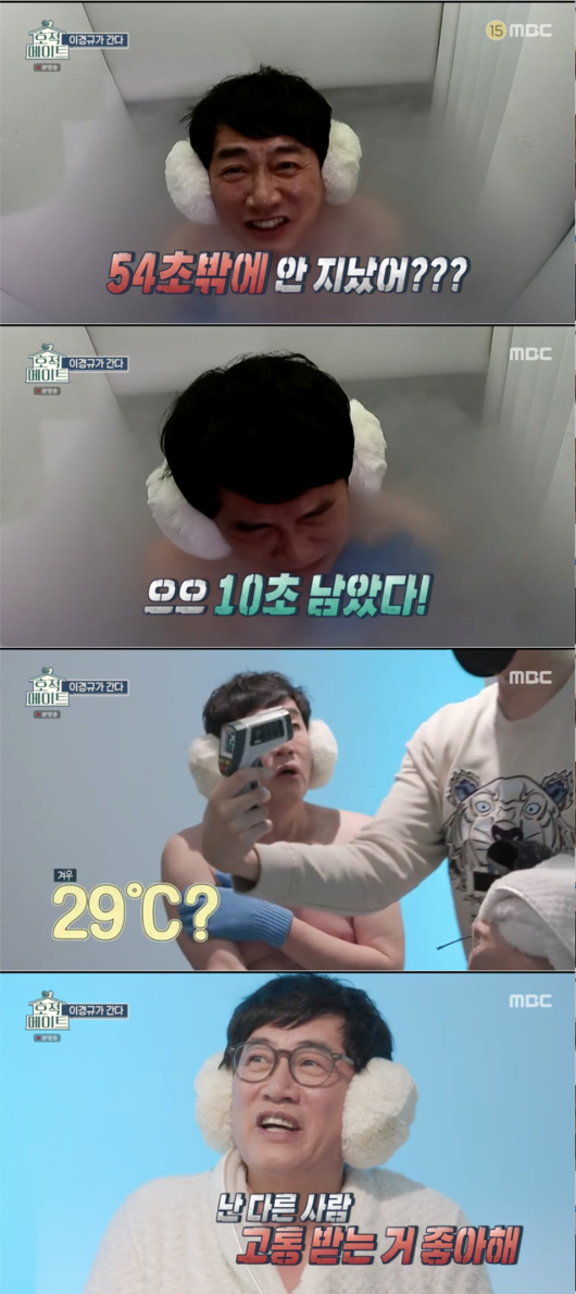 이후 이경규와 김영찬은 탈의가운과 귀마개를 한 채 등장했다. 영하 120도의 온도에 들어간 이경규는 “어우 추워. 아 이거 왜 이렇게 추워?”라며 온 몸을 떨었다. 이경규는 인터뷰에서 “겨울철 강원도에 동태가 찬바람에 마른 것처럼 추웠다”라고 말하기도.