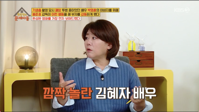 이정은은 “마더로 봉감독님을 처음 봤다. 단역부터 막내까지 이름을 다 외운다. 나중에 보니까 이름을 한 명 한 명 적어서 다 공부를 하더라”라며 봉준호 감독의 미담을 전했다.
