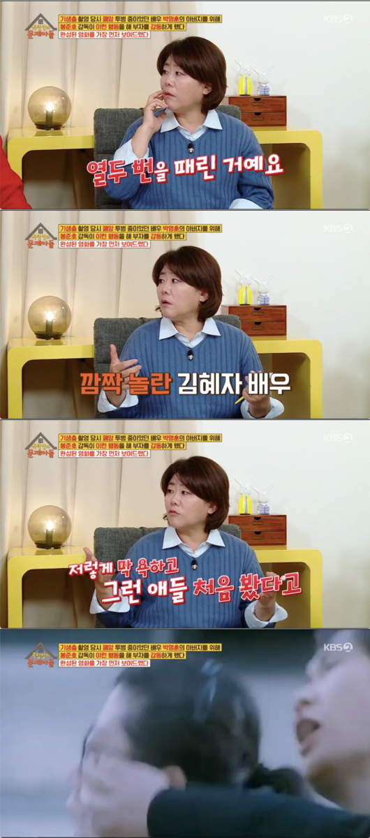 이정은은 “미공개 오디션으로 봤다. 김혜자 선생님 멱살 잡는 역할로 섭외가 됐다”라고 말헀다. 멱살 잡는 씬을 무려 3박 4일 동안 찍었다고. 이정은은 “첫 날에는 (저희가) 너무 세서 촬영이 중단됐다. 김혜자 선생님이 ‘저렇게 욕하고 그런 애들 처음 봤다’라고 했다”라고 설명해 웃음을 자아냈다.