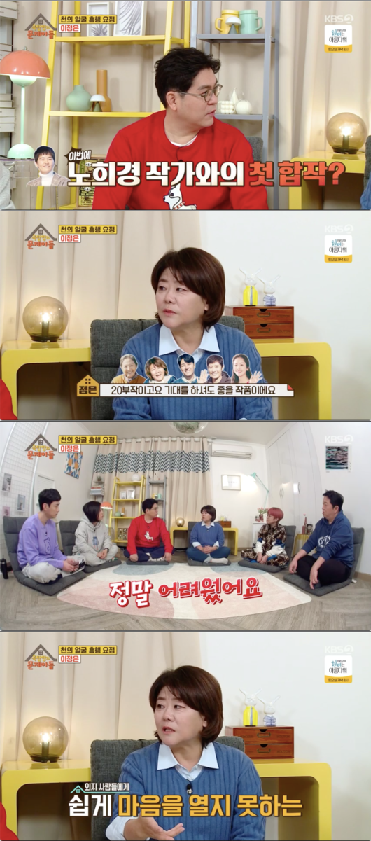 노희경 작가와의 작품을 앞두고 있는 이정은은 “20부작이고 기대를 해도 된다. 제주 생선 가게 사정 역할이다”라고 설명했다. 제주도 방언에 대해 이정은은 “정말 어려웠다. 용어가 달랐다. 알아듣기 해야하니까 풀어서 쓰기도 하고 어쩔 때는 직접 쓰기도 하고 그랬다”라고 덧붙였다.