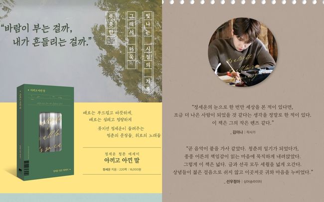 특히 작사가 김이나는 “정세운의 눈으로 한 번만 세상을 본 적이 있다면, 조금 더 나은 사람이 되었을 것 같다는 생각을 정말로 한 적이 있다. 이 책은 그의 작은 렌즈 같다”라며 에세이를 응원했다.