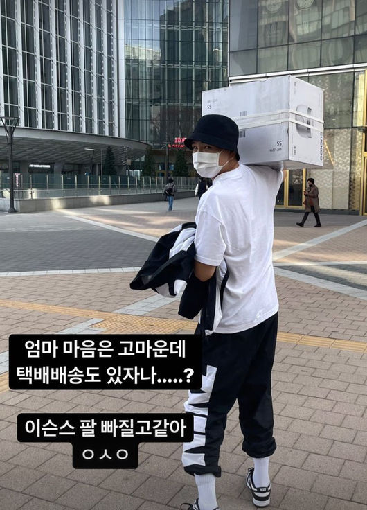 제이쓴은 "엄마 마음은 고마운데 택배배송도 있자나"라며 "이슨스 팔 빠질고 같아"라고 글을 남겼다. 공개된 사진 속에서 제이쓴은 어머니께 받은 전기밥솥이 담긴 박스를 어깨에 매고 카메라 쪽으로 눈을 흘기고 있어 웃음을 자아냈다.
