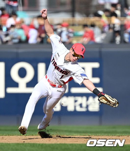 1회초 1사후 김태연의 타구가 약간 튀어오르며 포구에 실패했다. 두 번째가 문제였다. 이어진 2사 1,2루에서 하주석의 타구를 몸을 날려 좌익수 앞까지 굴러가는 것을 막았다. 2루주자가 3루에 머물 수 밖에 없었다. 훌륭한 수비였다. 만루위기가 됐지만 아웃카운트 1개를 잡으면 무실점으로 이닝을 막을 수도 있었다.