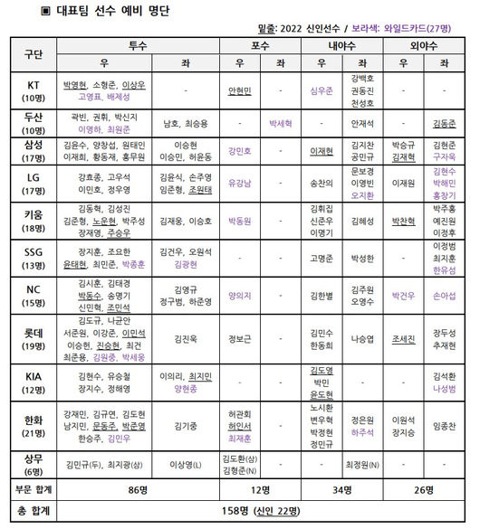 대표팀 예비 명단으로는 만 24세 이하 또는 입단 3년차 이하 선수 131명(신인 22명)과 와일드카드 27명 등 158명(투수 86명, 포수 12명, 내야수 34명, 외야수 26명 등)과 아마추어 선수 14명(투수 14명)까지 총 172명의 선수가 선발되어 7일(목) 대한야구소프트볼협회를 통해 대한체육회에 제출됐다.
