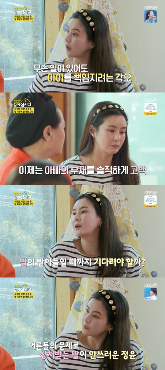 박원숙은 “(남편이랑) 떨어진 지 얼마나 됐어?”라고 물었고, 최정윤은 “3년 됐다. 우선순위는 딸이다. 부부가 아이를 내놨으면 당연히 책임을 져야한다. 아이를 위해 가장 좋은 방향을 찾자 이거다”라고말했다