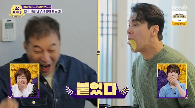 장민호는 "혓바닥에 단무지를 붙여서 이 집에서 잘 사는지 시험해보자"라고 제안했다. 이에 김갑수는 장민호의 혓바닥으로 단무지를 던졌고 바로 붙어 주위를 폭소케 했다. 이어 장민호도 김갑수의 혓바닥에 단무지를 던졌지만 이마에 맞아 실패해 웃음을 자아냈다.