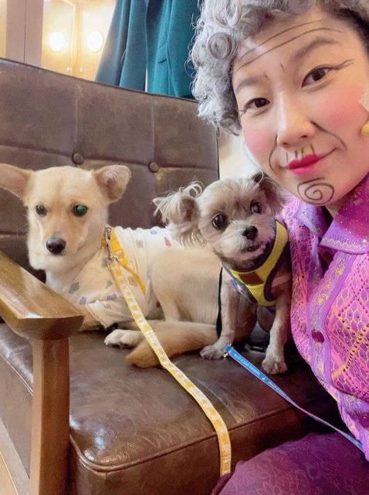 김영희는 16일 SNS에 "오늘은 황금이 동글이랑 함께 공연장"이라며 사진 한 장을 게재했다. 공개된 사진에는 김영희가 연극 '잇츠 홈쇼핑 주식회사' 무대를 위해 분장한 모습이 담겨 시선을 보았다.