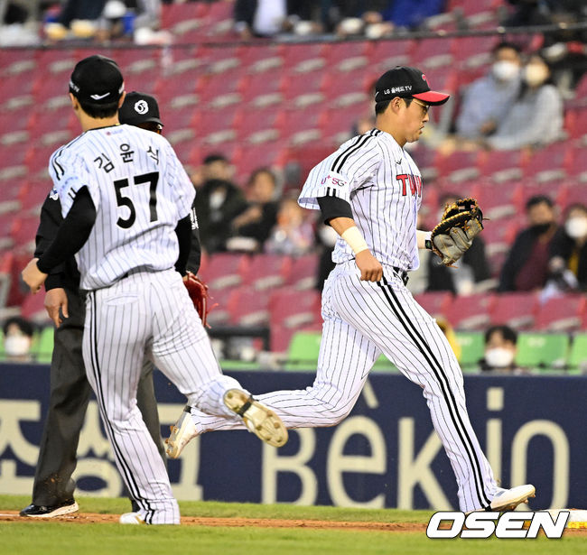 19일 KT전 5회초, LG 선발 김윤식은 심우준, 김민혁, 황재균에게 3타자 연속 안타를 맞고 1실점했다. 이어진 무사 1,3루에서 김윤식이 견제구로 1루 주자를 협살로 몰았는데, 1루수 채은성과 유격수 오지환이 공을 주고받아가 2루 베이스에 수비수가 없는 사이 황재균이 2루에서 세이프됐다.