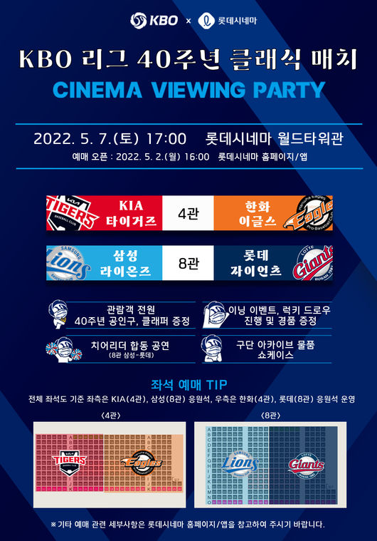 또한, 삼성-롯데 경기가 상영되는 8관에서는 삼성과 롯데 치어리더들이 합동 응원 공연을 선보이며, KBO 리그 40주년 클래식 매치의 의미를 더할 예정이다.